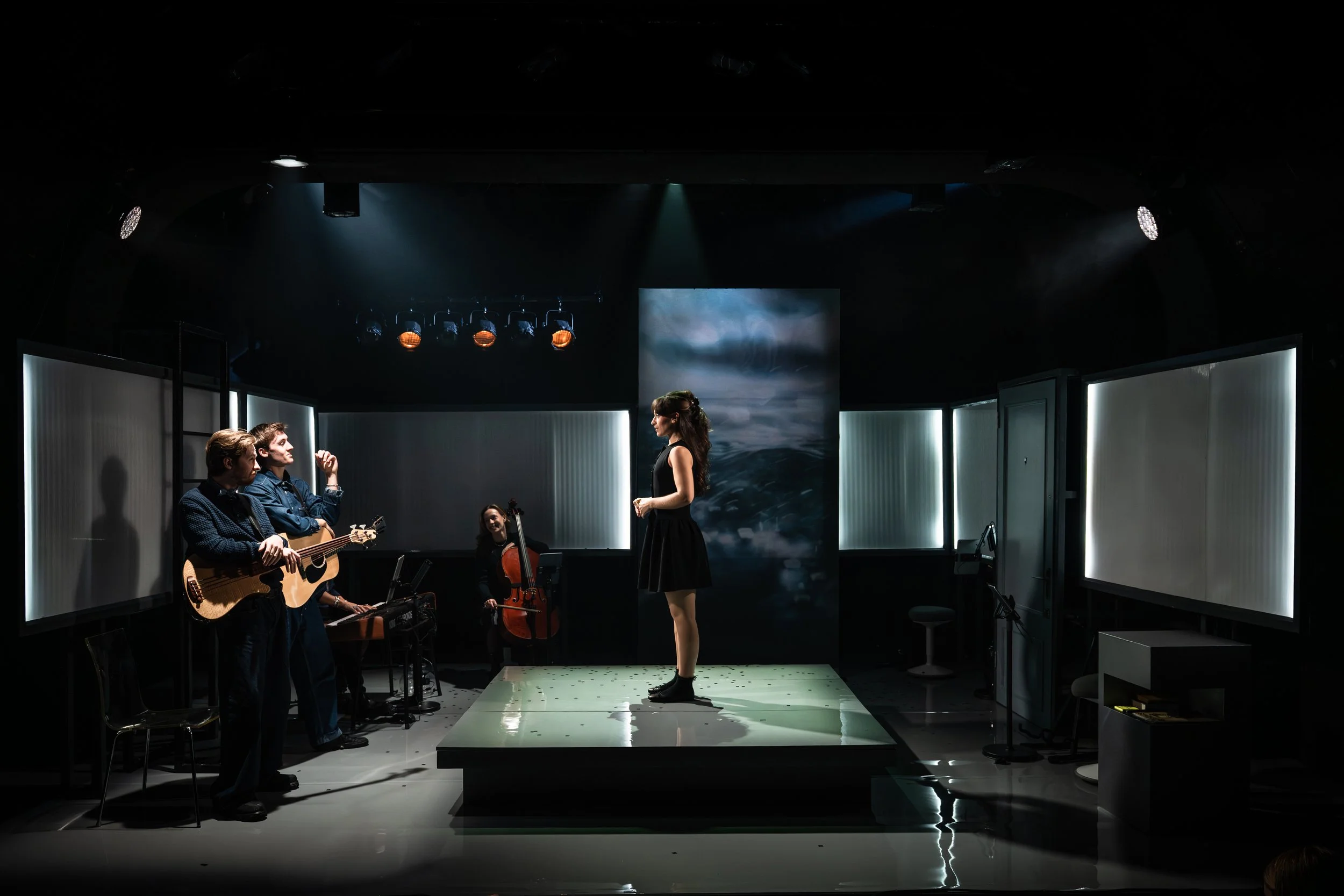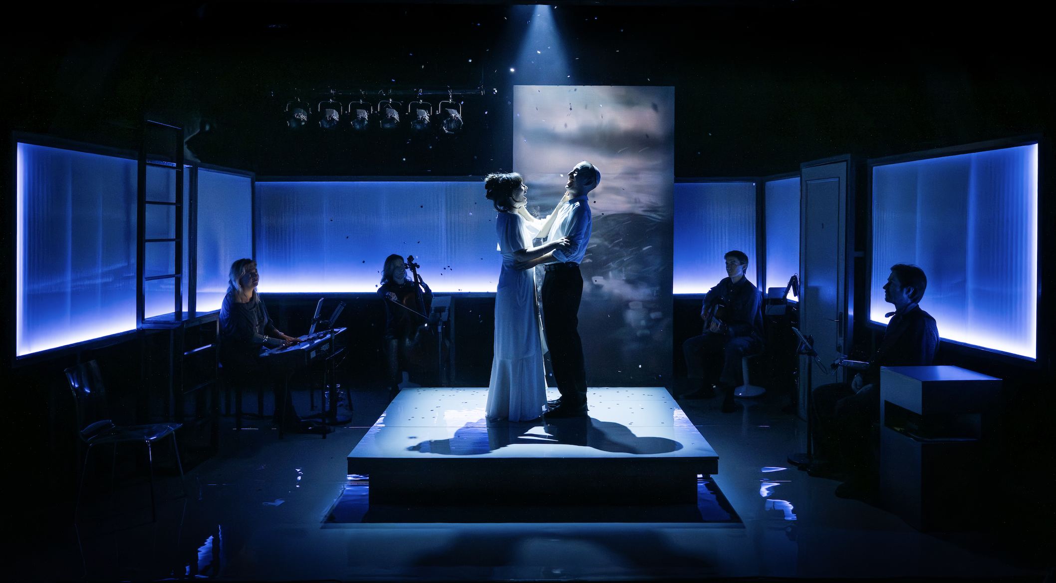 “The intimate size of the theatre is especially effective here, intensifying the emotional impact of every scene. This intimacy is actually emphasised by the central platform and screen behind it, with the musicians arranged around it for most of the action, until they are drawn into it towards the end. It is thanks to Cheek and to Chan’s lighting that the deceivingly basic set is nuanced to reflect mood, as the walls change colour from shades of primrose to blue, to mauve to grey as the story of the five years unfolds in both directions.” - Whats on stage